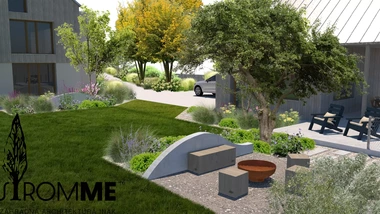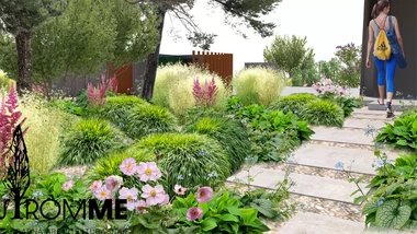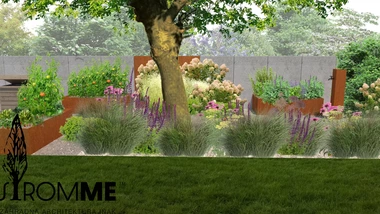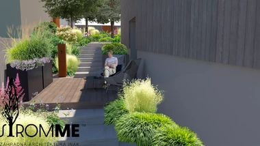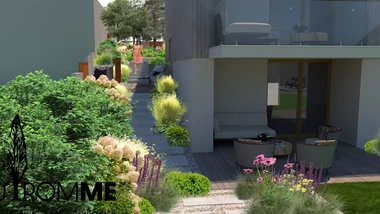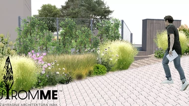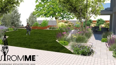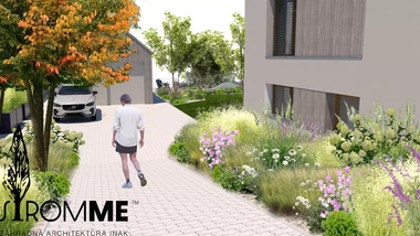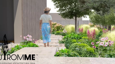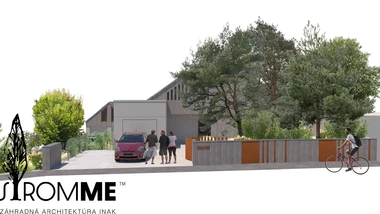 Riešený priestor záhrady začína rekonštrukciou oplotenia v prednej časti domu s ohľadom na jeho architektúru, za oplotením sa vynára tieňomilná výsadba pod borovicami s chodníkom vedúcim na severnú stranu pozemku. Prechádza do malej terasy na posedenie pri káve a pokračuje nepravidelnými betónovými schodnicami k hlavnej terase. Trasa je sprevádzaná nenáročnými trvalkovými vysadbami s vyššími kríkmi a dizajnovým plotom. Za hlavnou terasou sa medzi záhonmi otvára hlavný pobytový trávnik pre detské hry. Plocha trávnika pokračuje do okrasných záhonov oddeľujúcich ohnisko so sedením, ktorému na súkromí pridá betónová "vlna" s terénnou modeláciou. Ukryté sedenie za záhradným domom s garážou je výbornou alternatívou v tieni. Rozšírená terasa poskytne dostatočný priestor pre rodinné stretnutie. Na druhej strane pozemku pri orechu je vytvorená plocha s vyvýšenými záhonmi pre pestovanie byliniek a zeleniny. Poslednú časť záhrady tvorí prechod k potoku a susednému pozemku v podobe jednoduchých drevených mól. Vďaka tomu sa vytvorí ideálny prechod pre deti aj dospelých.