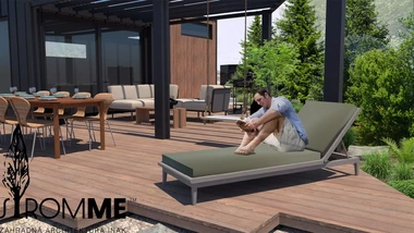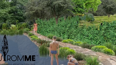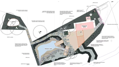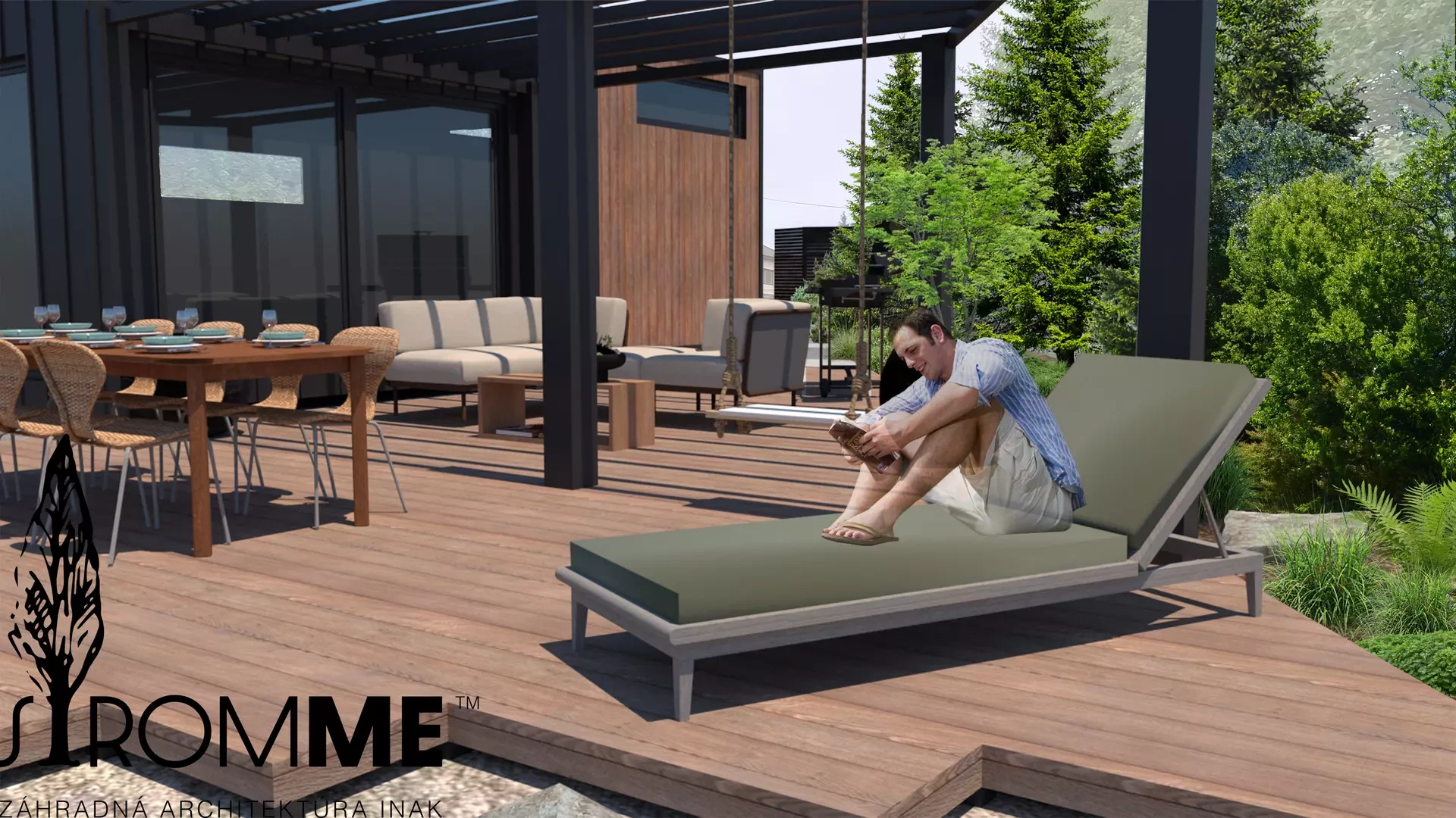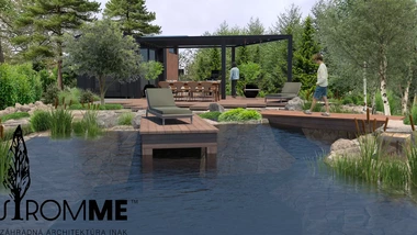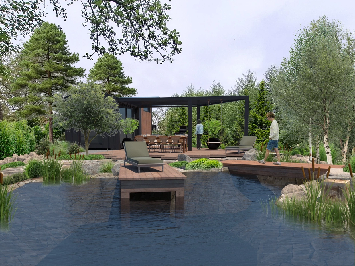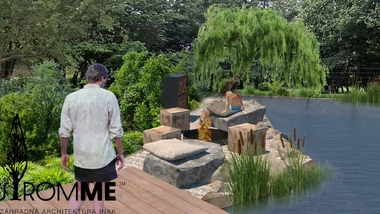 Zámer: osadenie rekreačnej chaty na pozemku so zakomponovaním veľkorysej terasy a zakomponovanie a úprava existujúceho jazierka. Pomocou zelene vytvoriť dostatočné súkromie a dotvoriť priestor na víkendový oddych.