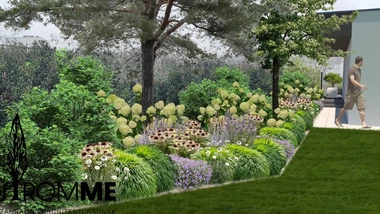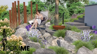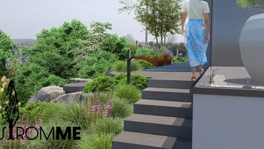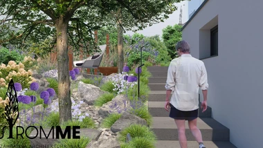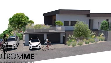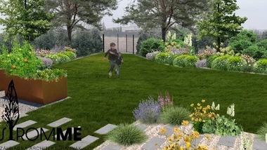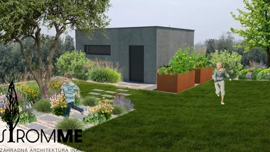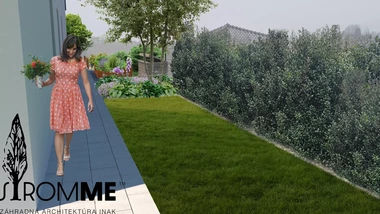 Zámer: vytvoriť pokojné a na údržbu nenáročné prostredie pre mladú rodinu s miestom pre oddych, ale aj priestor pre hry, či pestovanie drobnej zeleniny. Tiež pomocou zelene vytvoriť súkromie a príjemné zatienenie.