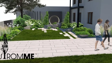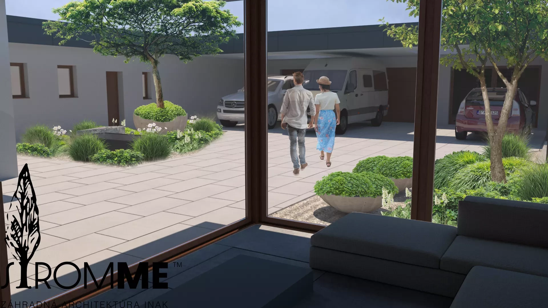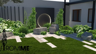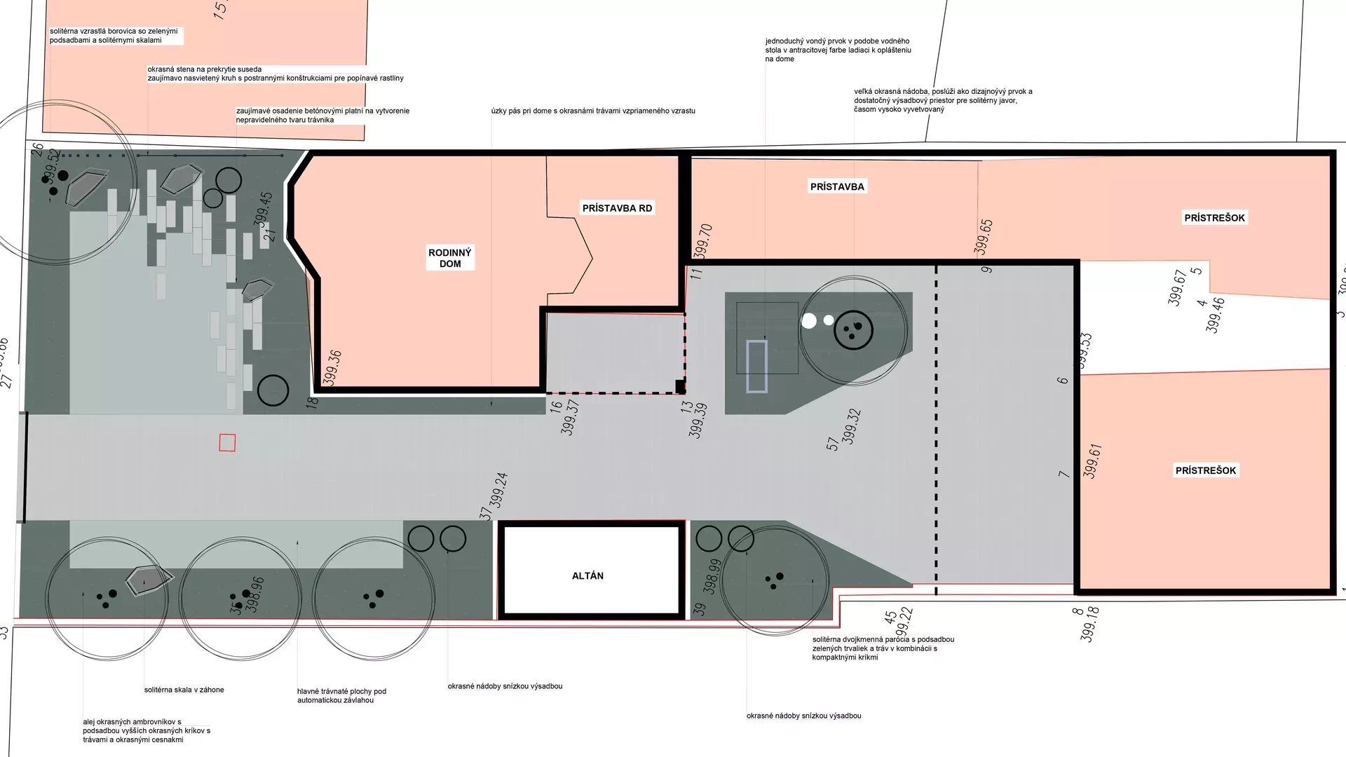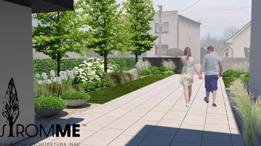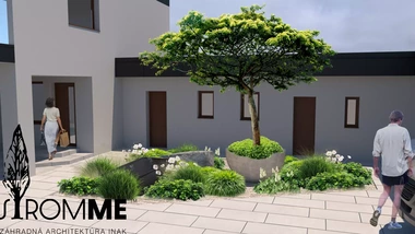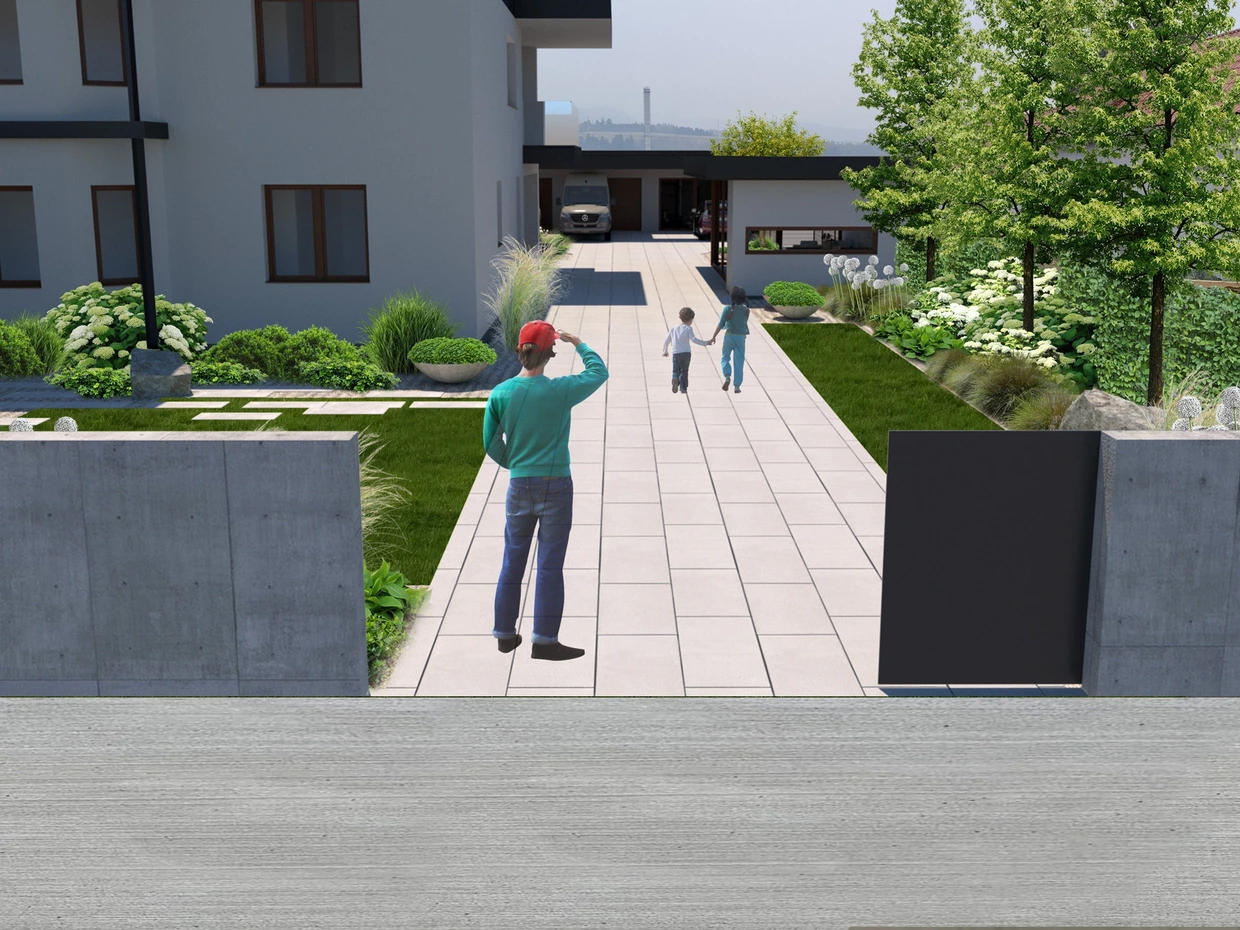 Zámer: vytvoriť na malých priestoroch medzi dlažbou a stavbami výraznú zelenú, s využitím trvalkových výsadieb, a to najmä okrasných so zakomponovaním zaujímavých prvkov ako je vodná nádrž, či kvetináče. Prekryť susednú stavbu a vytvoriť reprezentatívny vstup do priestoru záhrady a k domu.