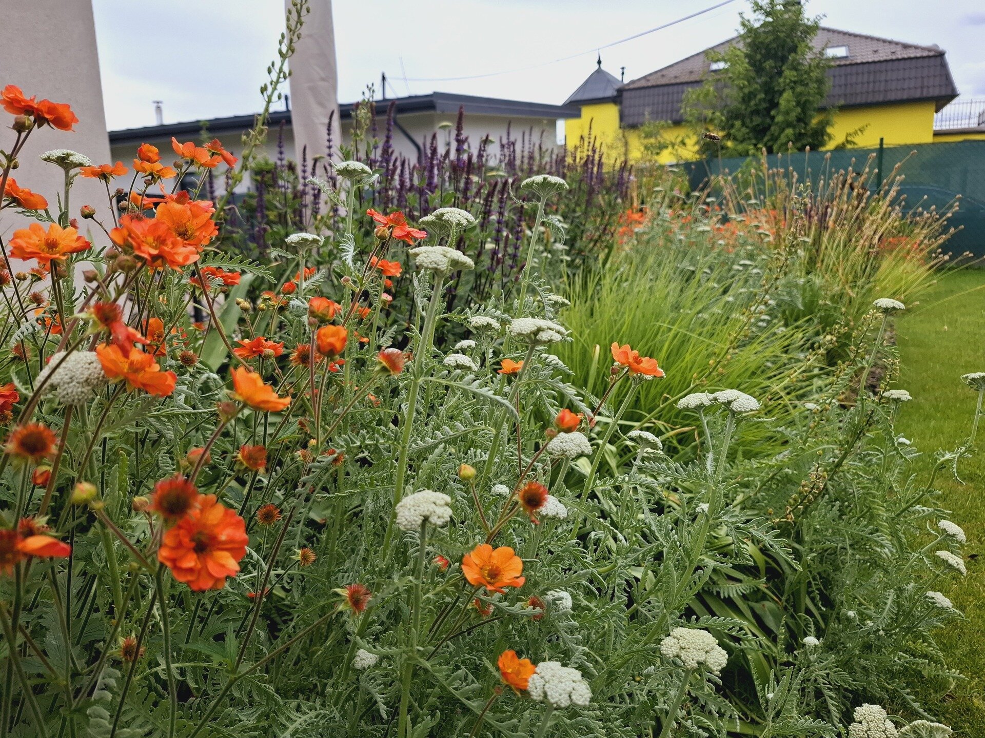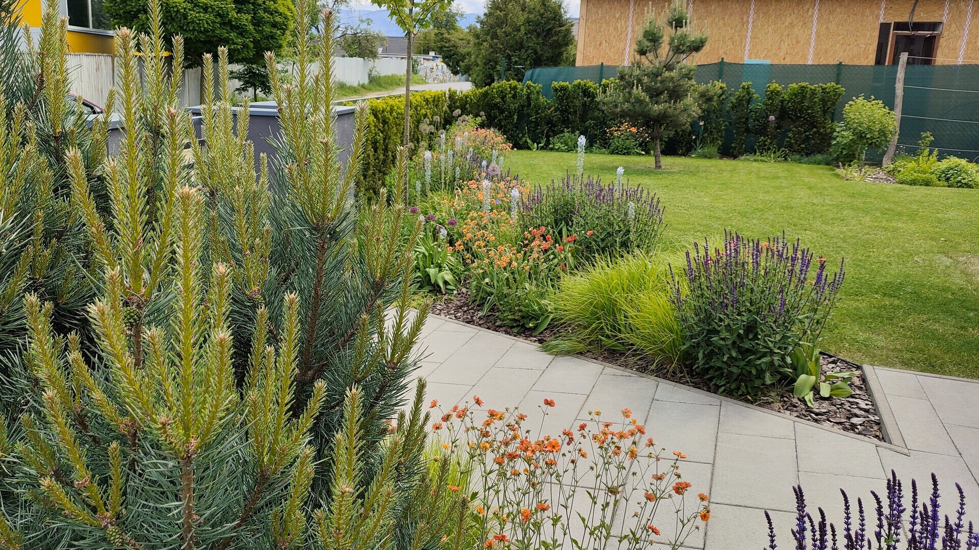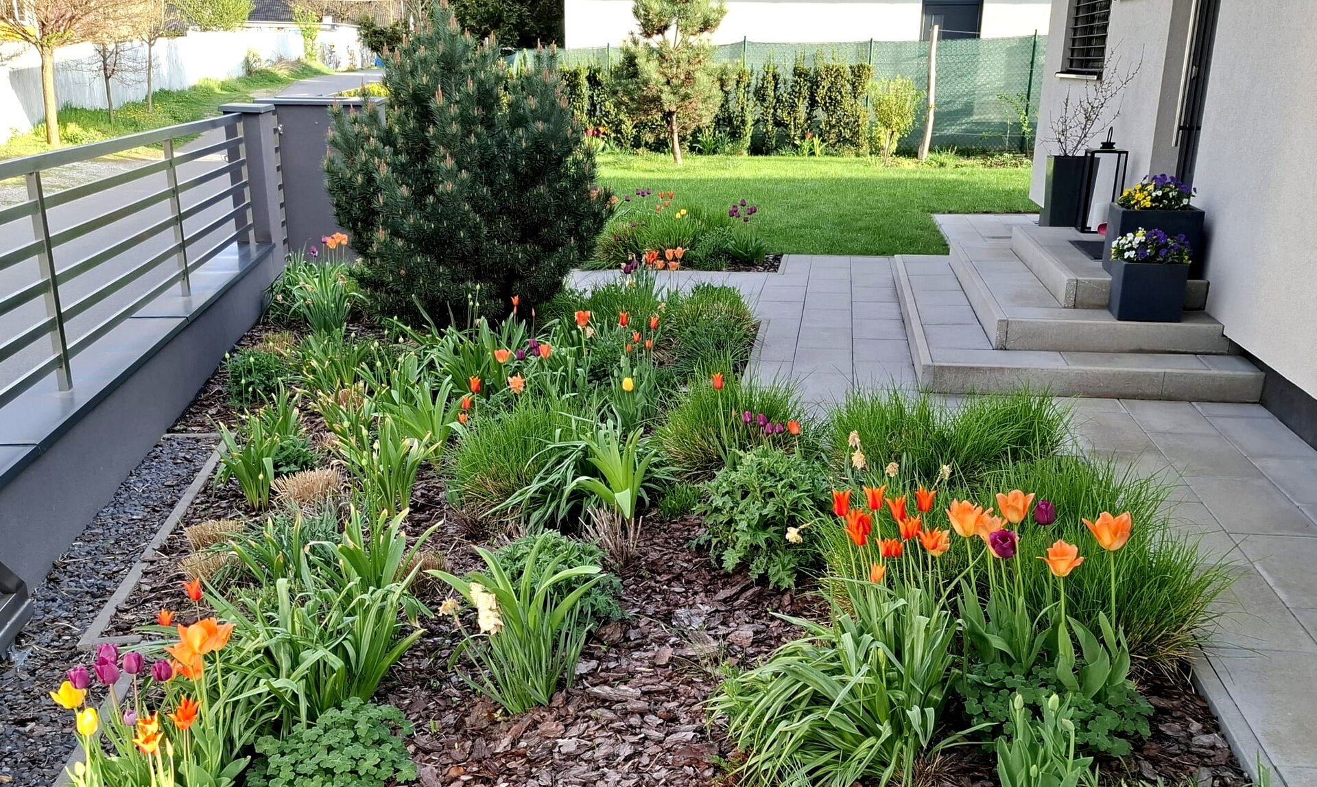 Riešenie: hlavnou myšlienkou záhrady je prvok farebnosti naprieč ročnými obdobiami, vďaka veľkému sortimentu jarných cibuľovín, ktoré sú vystriedané bohato kvitnúcimi trvalkami, ktoré zabezpečia, že od jari až do neskorej jesene sa v záhonoch objavuje kombinácia odtieňov fialovej, žltej a oranžovej. Tisový živý plot vytvára krytie od ulice a zároveň pôsobí ako zelené plátno, na ktorom vyniknú všetky farby. Samotné tvary sú priame a jednoduché, čím záhrada pôsobí moderne. Postupne v trávniku rastie borovica čierna a v záhone sa ukazuje javor červený, ktorý na jeseň hrá výraznými farbami olistenia.