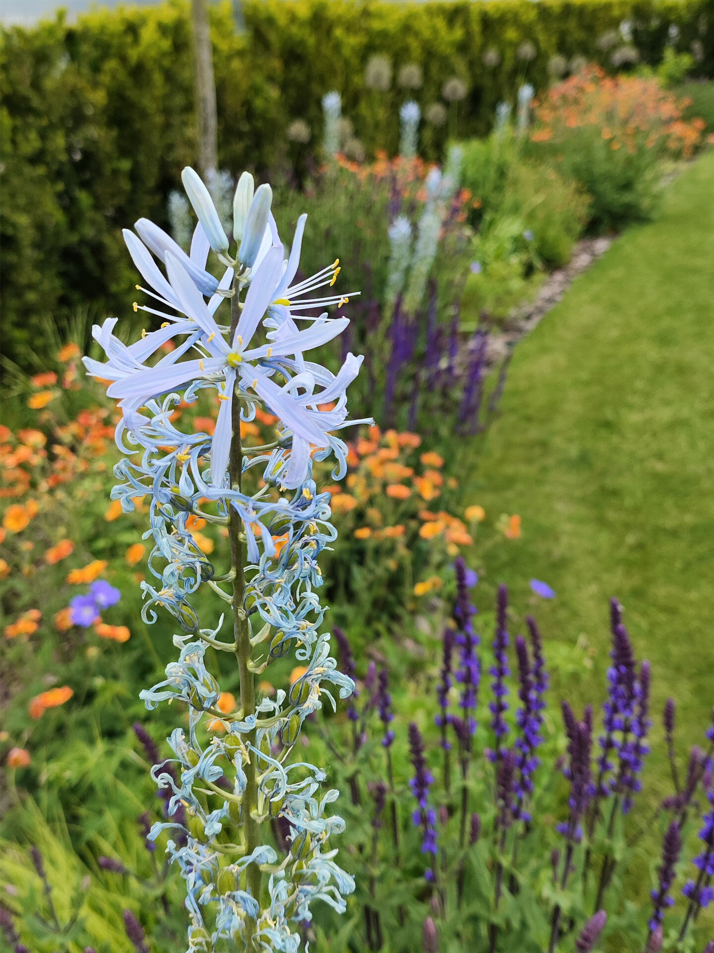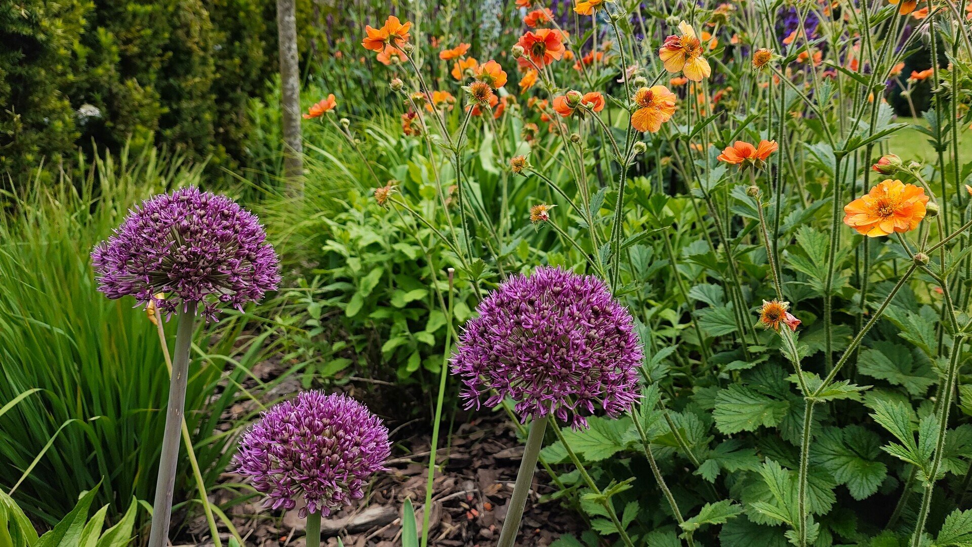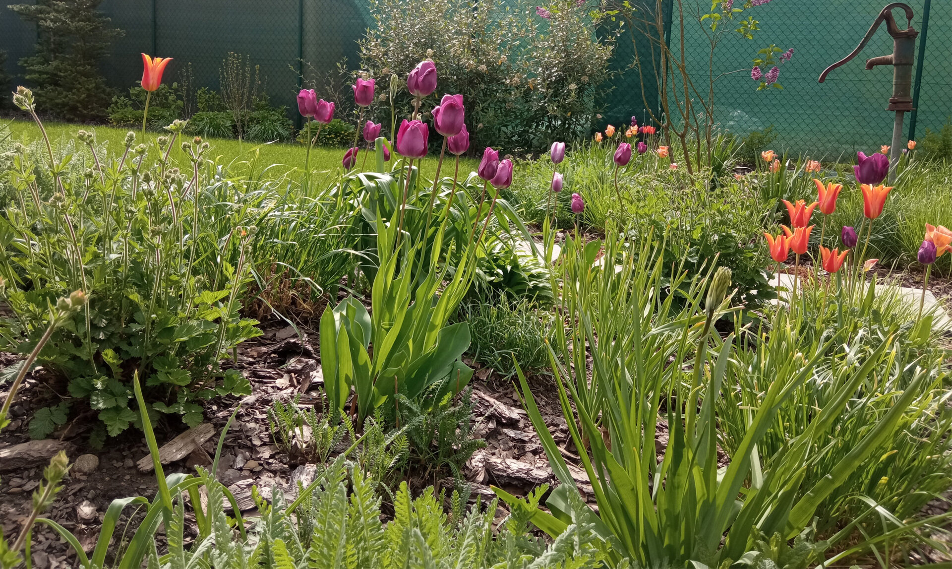 Riešenie: hlavnou myšlienkou záhrady je prvok farebnosti naprieč ročnými obdobiami, vďaka veľkému sortimentu jarných cibuľovín, ktoré sú vystriedané bohato kvitnúcimi trvalkami, ktoré zabezpečia, že od jari až do neskorej jesene sa v záhonoch objavuje kombinácia odtieňov fialovej, žltej a oranžovej. Tisový živý plot vytvára krytie od ulice a zároveň pôsobí ako zelené plátno, na ktorom vyniknú všetky farby. Samotné tvary sú priame a jednoduché, čím záhrada pôsobí moderne. Postupne v trávniku rastie borovica čierna a v záhone sa ukazuje javor červený, ktorý na jeseň hrá výraznými farbami olistenia.