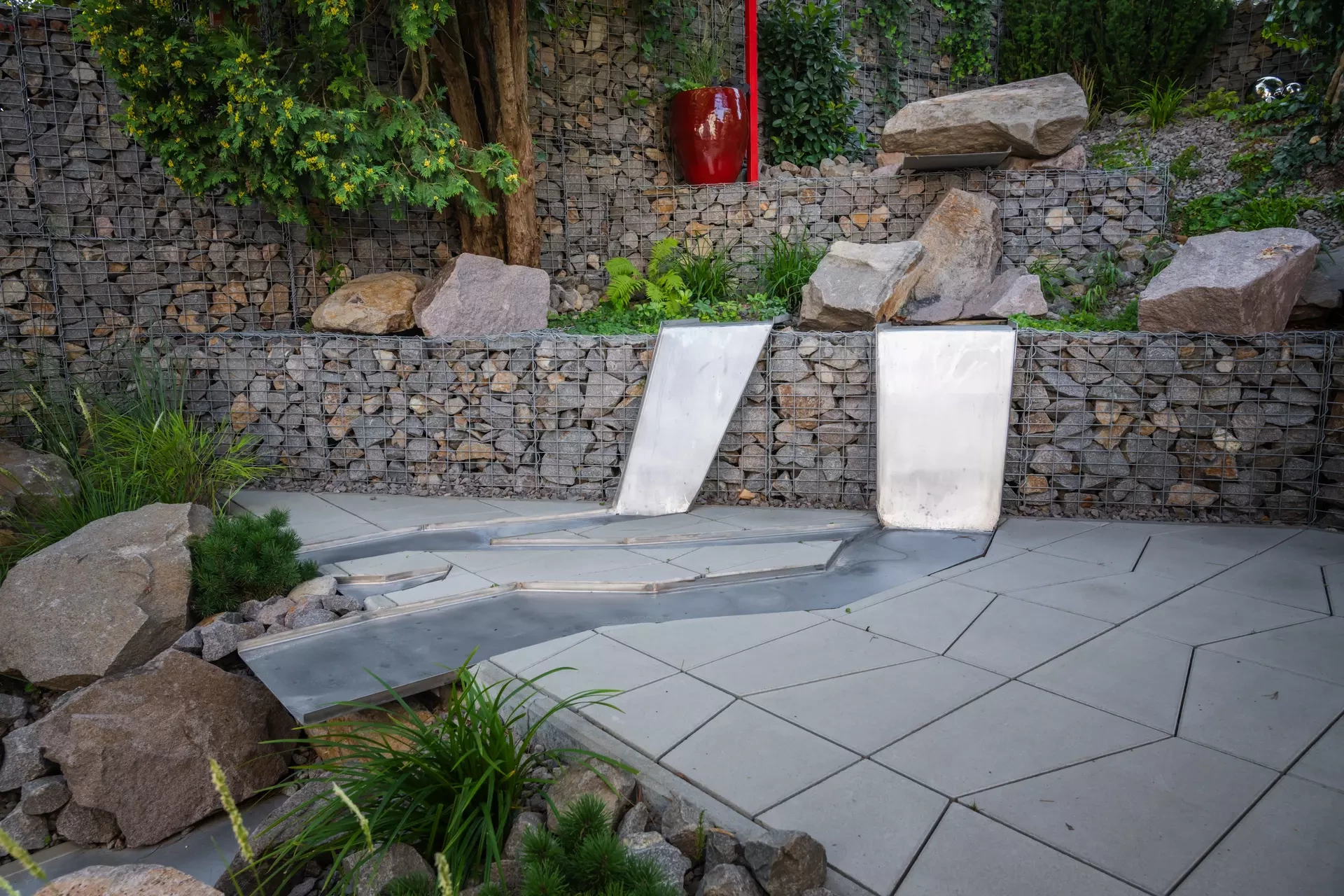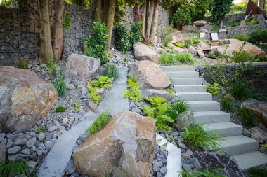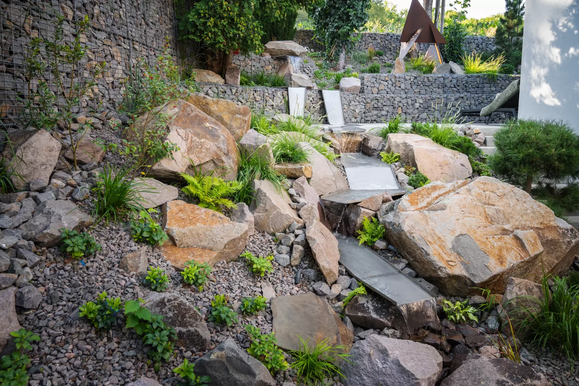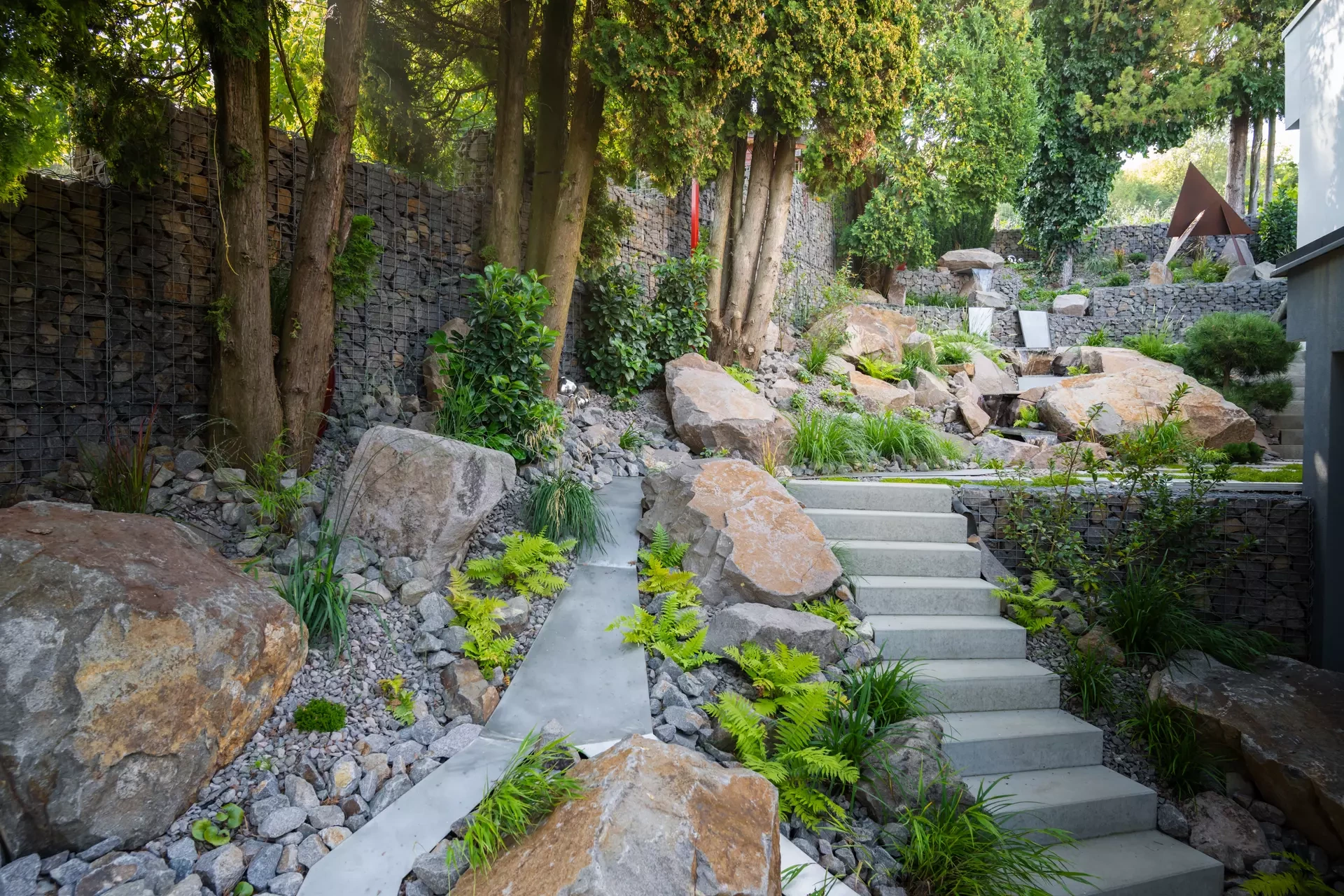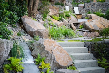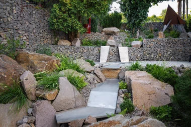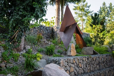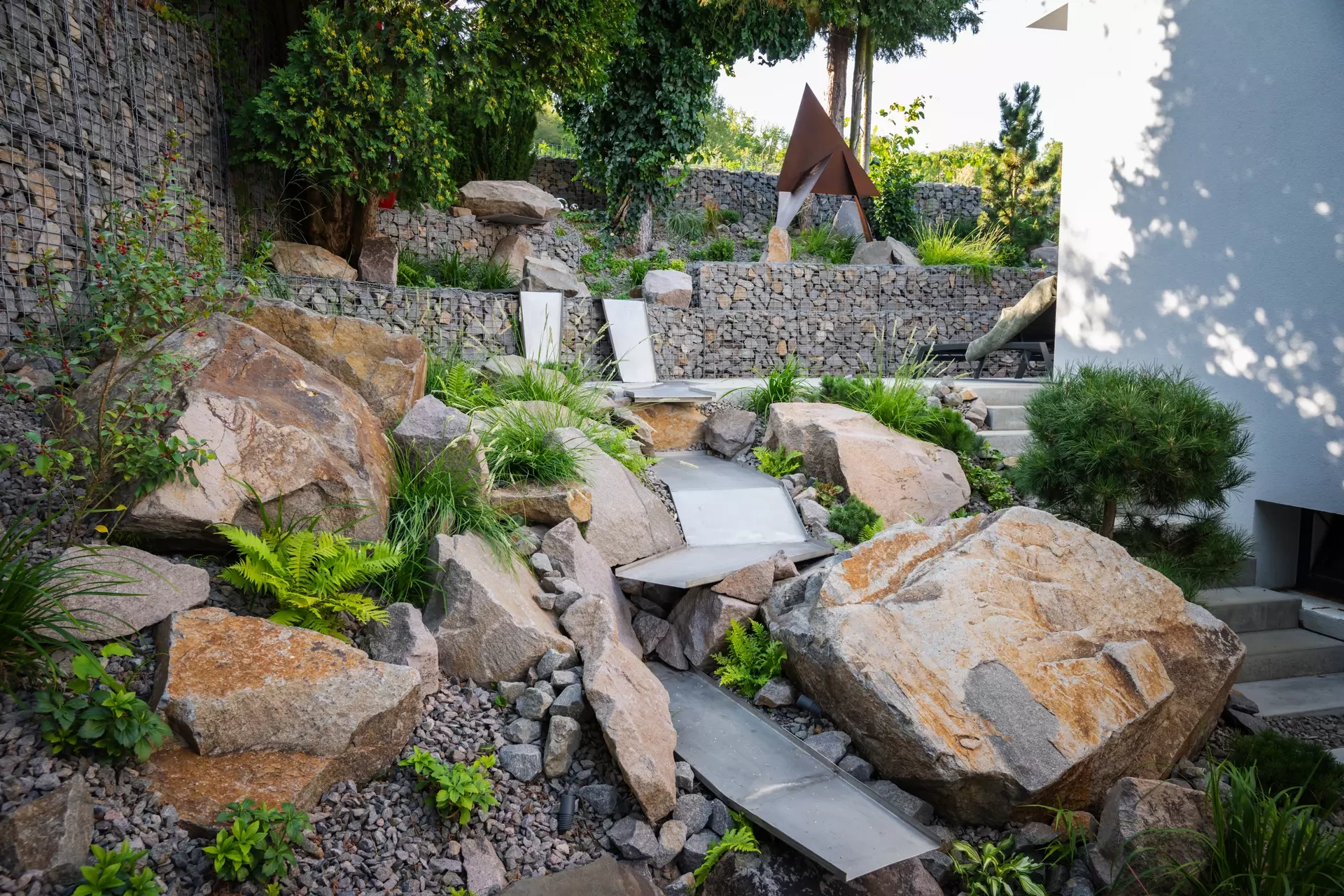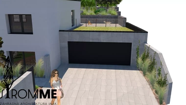 Riešenie: celý pozemok je rozdelený na tri terasy, pričom najnižšie položená časť záhrady tvorí spoločenskú a oddychovú zónu pre majiteľov. V priestore je osadený altán so zapusteným sedením a ohniskom, ku ktorému vedie šlapákový chodník od domu. Ten zároveň prepája vyvýšenú platformu so saunou a polozapustenou vírivkou a kaďou. Okolitú zeleň tvoria existujúce stromy, ktoré návrh dopĺňa stálozelenými výsadbami kríkov, trvaliek, tráv a papradí, vyznačujúce sa potlačeným, či žiadnym kvitnutím. Celá záhrada je tak ladená v odtieňoch zelenej. Šlapákový chodník sa pri dome rozdeľuje a druhá časť vedie k horným častiam pozemku, pričom na hranici popri gabiónovom múre sú svahy riešené veľkými skalami, ktoré tvoria základ pre potok. Ten je v najvyššej a strednej časti plnohodnotným vodným prvkom, pričom sú jednotlivé kaskády tvorené tvarovanými antikorovými korytami. Vodný prvok je ukončený na strednej terase a odtiaľ, smerom na strednú časť pozemku je vedený už len v podobe náznaku - "antikorový prameň". Výsadby pokračujú v rovnakom zelenom duchu a nadväzujú na existujúce výsadby stromov. V celej záhrade sa v záhonoch objavujú umelecké diela, ktoré tak ozvláštňujú pohľady do záhrady.
