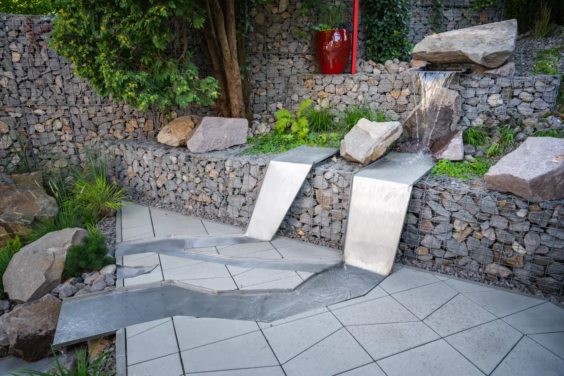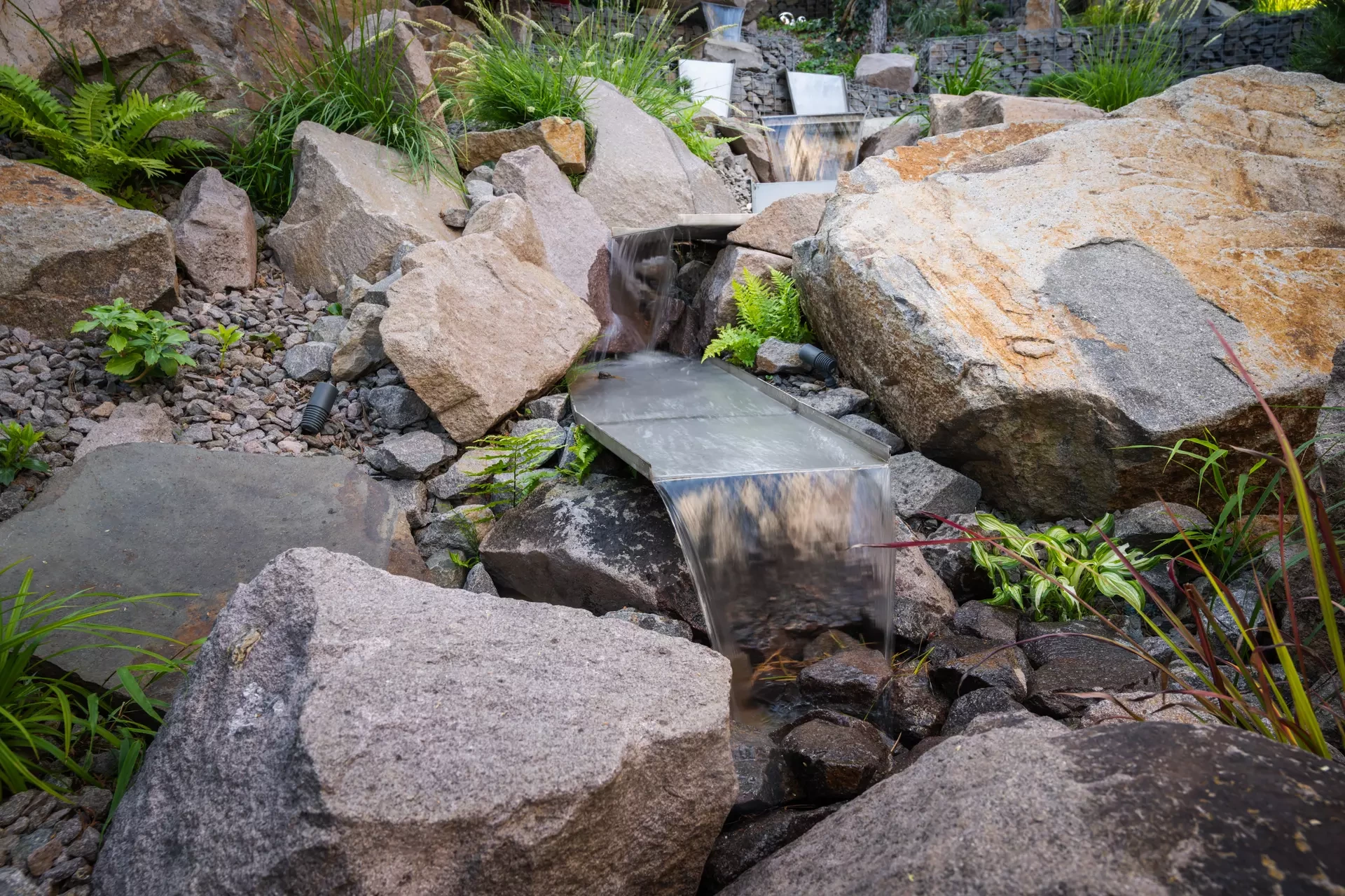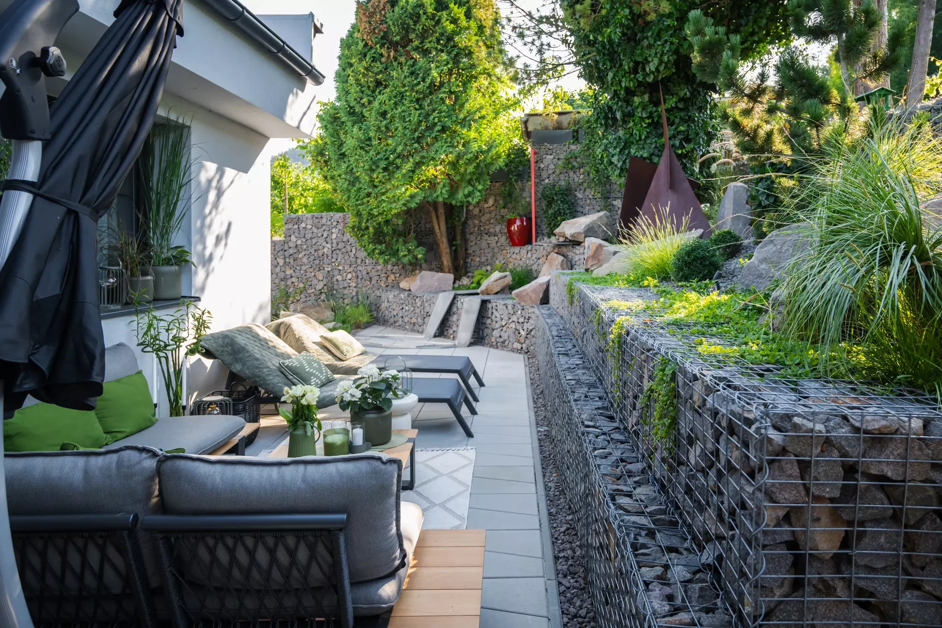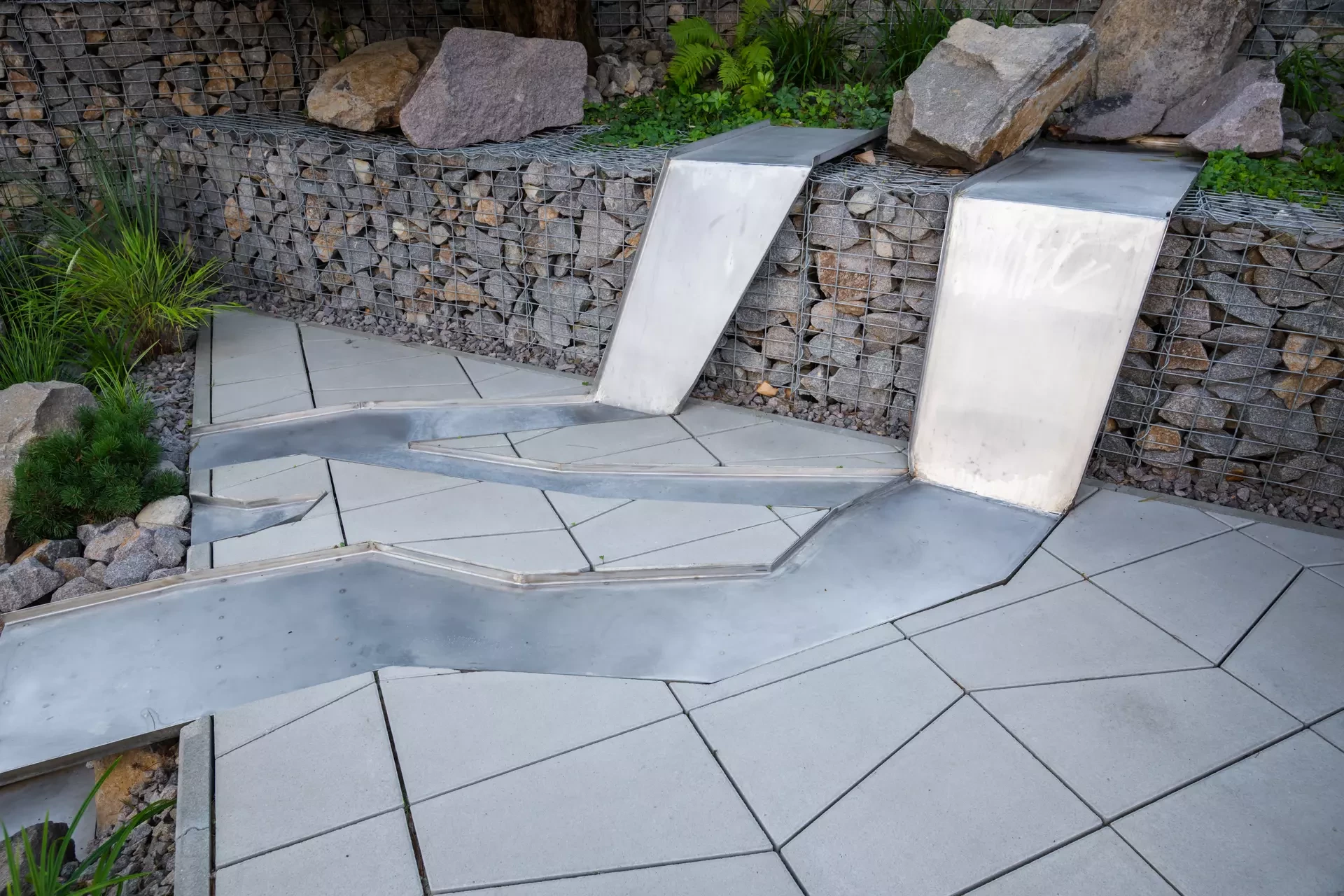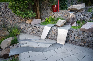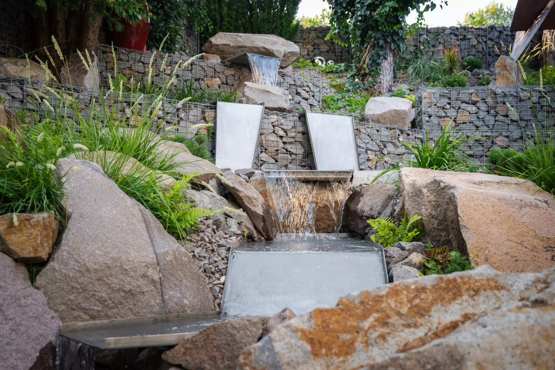 Riešenie: celý pozemok je rozdelený na tri terasy, pričom najnižšie položená časť záhrady tvorí spoločenskú a oddychovú zónu pre majiteľov. V priestore je osadený altán so zapusteným sedením a ohniskom, ku ktorému vedie šlapákový chodník od domu. Ten zároveň prepája vyvýšenú platformu so saunou a polozapustenou vírivkou a kaďou. Okolitú zeleň tvoria existujúce stromy, ktoré návrh dopĺňa stálozelenými výsadbami kríkov, trvaliek, tráv a papradí, vyznačujúce sa potlačeným, či žiadnym kvitnutím. Celá záhrada je tak ladená v odtieňoch zelenej. Šlapákový chodník sa pri dome rozdeľuje a druhá časť vedie k horným častiam pozemku, pričom na hranici popri gabiónovom múre sú svahy riešené veľkými skalami, ktoré tvoria základ pre potok. Ten je v najvyššej a strednej časti plnohodnotným vodným prvkom, pričom sú jednotlivé kaskády tvorené tvarovanými antikorovými korytami. Vodný prvok je ukončený na strednej terase a odtiaľ, smerom na strednú časť pozemku je vedený už len v podobe náznaku - "antikorový prameň". Výsadby pokračujú v rovnakom zelenom duchu a nadväzujú na existujúce výsadby stromov. V celej záhrade sa v záhonoch objavujú umelecké diela, ktoré tak ozvláštňujú pohľady do záhrady.