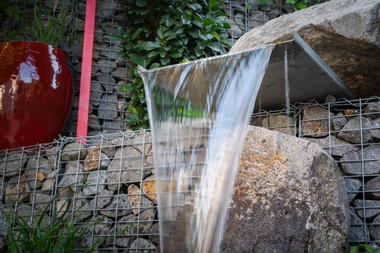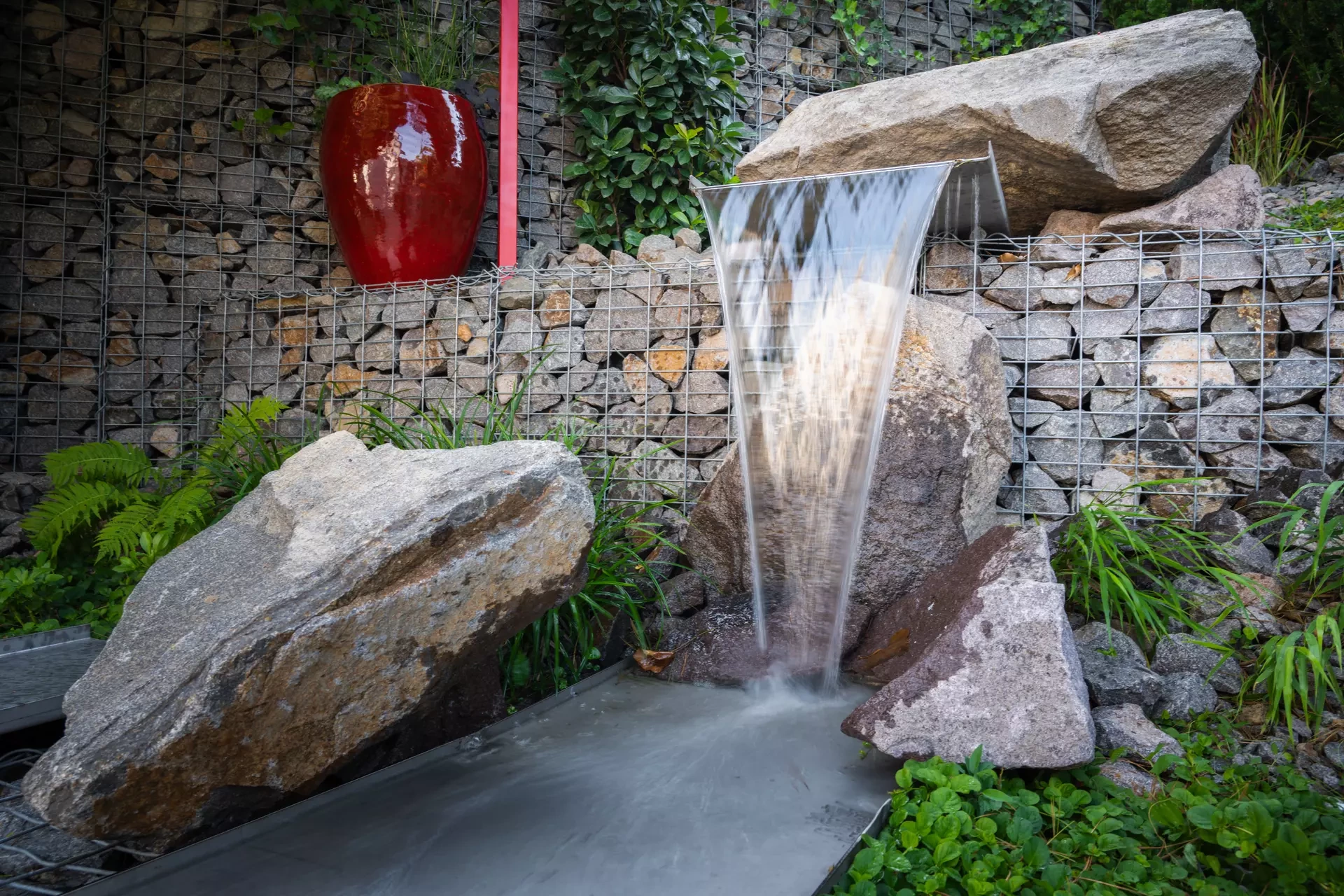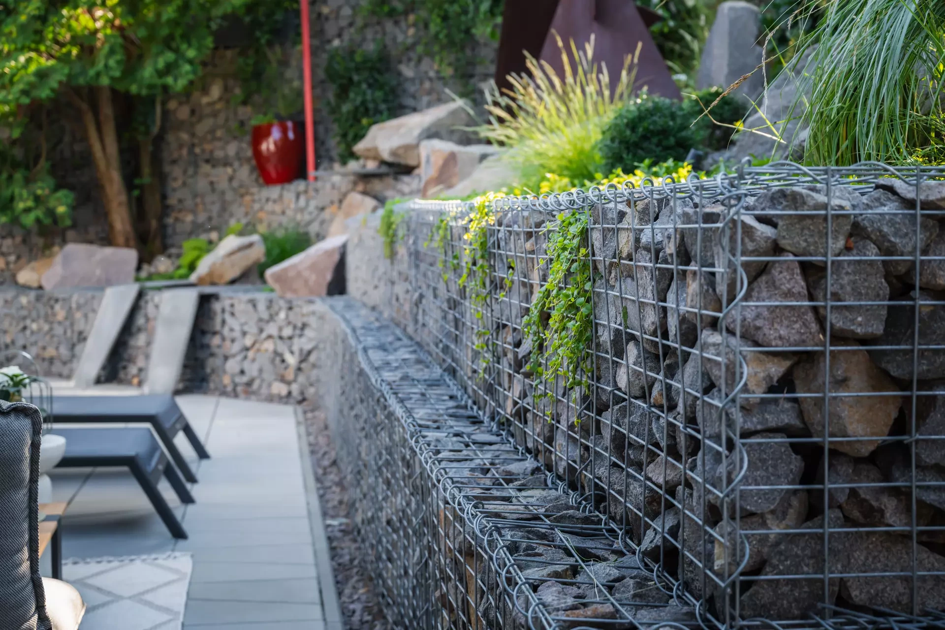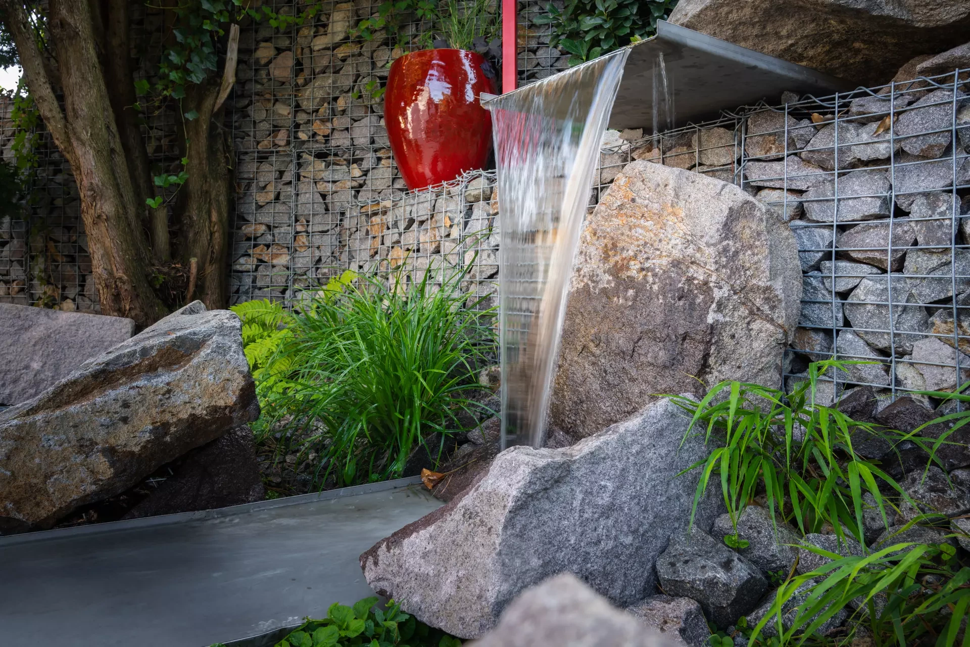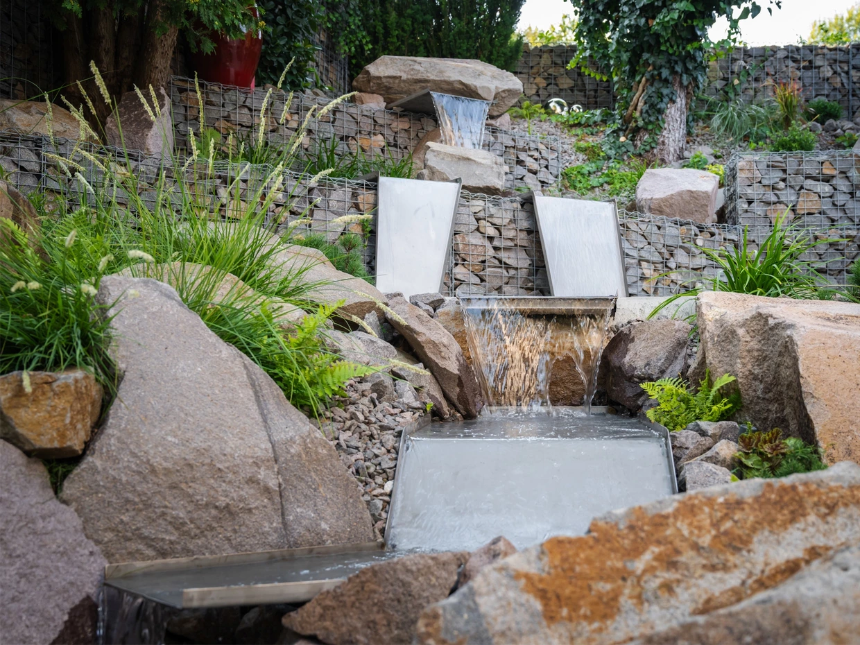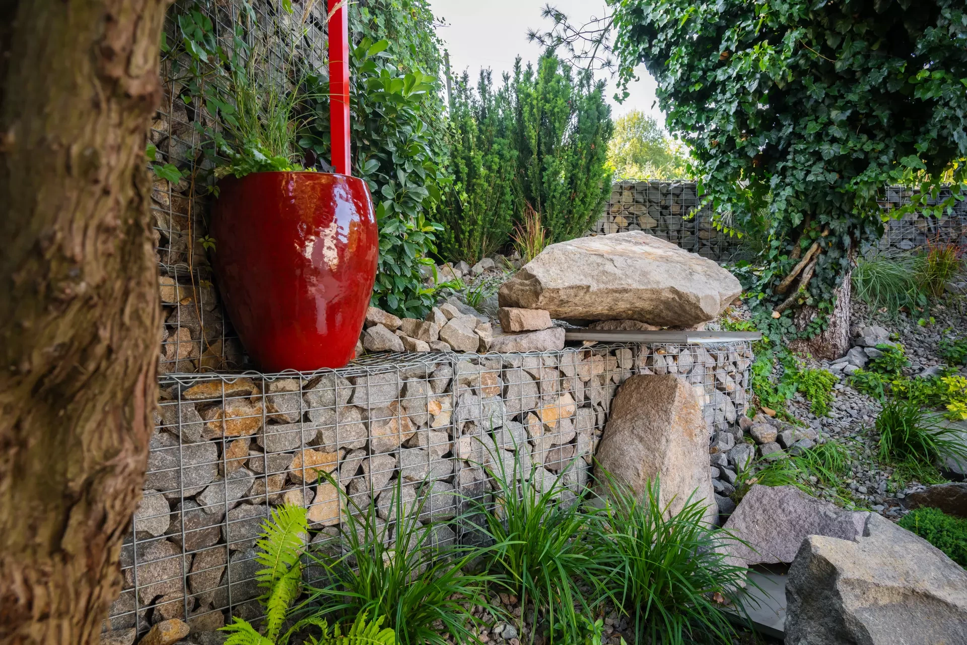 Riešenie: celý pozemok je rozdelený na tri terasy, pričom najnižšie položená časť záhrady tvorí spoločenskú a oddychovú zónu pre majiteľov. V priestore je osadený altán so zapusteným sedením a ohniskom, ku ktorému vedie šlapákový chodník od domu. Ten zároveň prepája vyvýšenú platformu so saunou a polozapustenou vírivkou a kaďou. Okolitú zeleň tvoria existujúce stromy, ktoré návrh dopĺňa stálozelenými výsadbami kríkov, trvaliek, tráv a papradí, vyznačujúce sa potlačeným, či žiadnym kvitnutím. Celá záhrada je tak ladená v odtieňoch zelenej. Šlapákový chodník sa pri dome rozdeľuje a druhá časť vedie k horným častiam pozemku, pričom na hranici popri gabiónovom múre sú svahy riešené veľkými skalami, ktoré tvoria základ pre potok. Ten je v najvyššej a strednej časti plnohodnotným vodným prvkom, pričom sú jednotlivé kaskády tvorené tvarovanými antikorovými korytami. Vodný prvok je ukončený na strednej terase a odtiaľ, smerom na strednú časť pozemku je vedený už len v podobe náznaku - "antikorový prameň". Výsadby pokračujú v rovnakom zelenom duchu a nadväzujú na existujúce výsadby stromov. V celej záhrade sa v záhonoch objavujú umelecké diela, ktoré tak ozvláštňujú pohľady do záhrady.